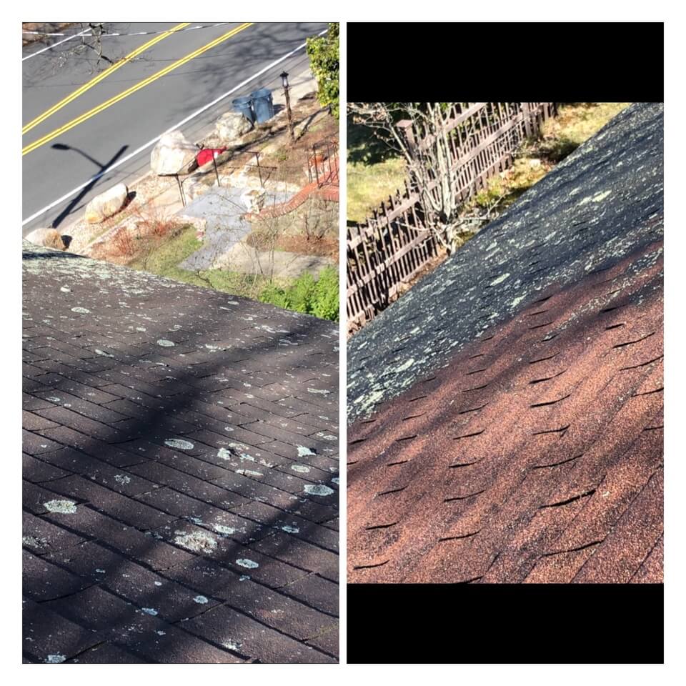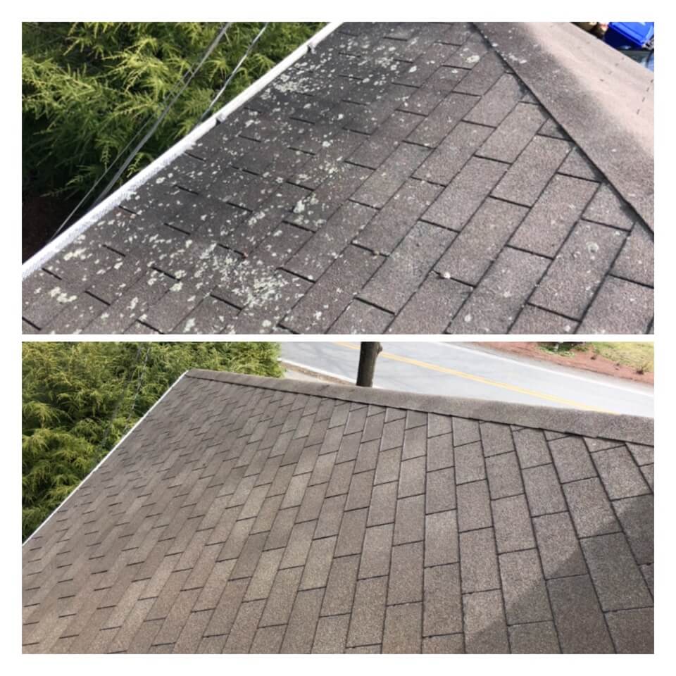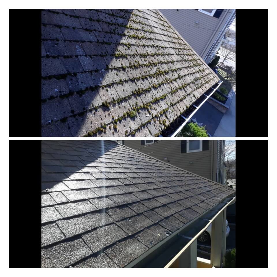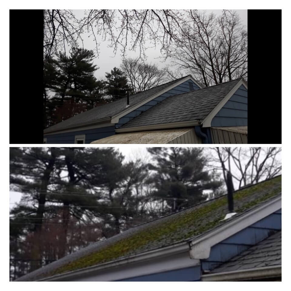 HiCleaners is the most experienced company in Easton, MA that deals with roof washing and roof soft washing. All of our employees are trained to recognize precise solution mixing ratios to provide you with the safest and most effective soft washing service. Roofs are a commonly neglected part of a house due to the fact that most people don’t have ladders to access it, so it is very easy to just leave it alone and forget about problems that may start to arise. Just like many home owners, discoloration and small bits of moss on a roof can be overlooked because of the misconception that it is just aesthetic. However, it isn’t just aesthetic, the moss slowly lifts the granules off the shingles which in turn shorten the life of the shingle. The moss also spreads, just like any bacteria if it is left alone for too long, it can quickly become a problem that spirals out of control. Call HiCleaners for a free quote, we only use the most advanced eco-friendly solutions and equipment to make sure the job is done right, for the safety of the employees, your plants, grass, pets, and children.